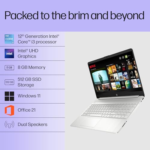 About this item Processor: Intel Core i3-1215U (up to 4.4 GHz with Intel Turbo Boost Technology, 10 MB L3 cache, 6 cores, 8 threads)| Memory: 8 GB DDR4-3200 MHz RAM (1 x 8 GB)| Storage: 512 GB PCIe NVMe M.2 SSD Display: 39.6 cm (15.6″) diagonal, FHD (1920 x 1080), micro-edge, anti-glare, 250 nits, 45% NTSC Operating System: Windows 11 Home Single Language |Microsoft Office Home & Student Edition 2021 Ports: 1 USB Type-C 5Gbps signaling rate (supports data transfer only and does not support charging or external monitors); 2 USB Type-A 5Gbps signaling rate; 1 AC smart pin; 1 HDMI 1.4b; 1 headphone/microphone combo | Networking: Realtek RTL8822CE 802.11a/b/g/n/ac (2×2) Wi-Fi and Bluetooth 5 wireless card Other Features: Camera: HP True Vision 720p HD camera with temporal noise reduction and integrated dual array digital microphones| Keyboard : Full-size, natural silver keyboard with numeric keypad |Battery: 3-cell, 41 Wh Li-ion; Up to 7 hours and 30 minutes |Audio: Dual speakers