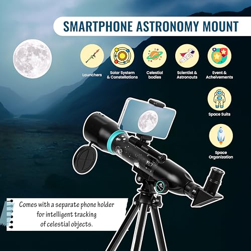 About this item DISCOVER: The Audavibe 40050 Telescope with Arya’s Space Odyssey App takes you on a captivating journey through space. Connect your phone to the telescope and use the companion app to unlock 1000+ fascinating facts about the Solar System, Celestial Bodies, Space Organizations, Scientists & Astronauts, and Events & Achievements. Engage with the Skymap feature to explore the cosmos in real-time and enjoy AstroReels for fun, educational space-themed reels. LEARN: Dive into over 1000 intriguing facts across five categories – Solar System, Celestial Bodies, Space Organizations and their launchers & spacesuits, Scientists and Astronauts, and Space Events & Achievements. Use the interactive Skymap to identify stars, planets, and constellations. Participate in fun quizzes and challenges designed to enhance your knowledge about space. FOR SPACE ENTHUSIASTS : Ideal for curious minds, this telescope and app combo sparks imagination and a love for astronomy. It supports learning in subjects like space science, astronomy, physics, and history, making it a perfect educational tool for young explorers. One of the best choice of Telescope for Gifting IN THE BOX: The package includes a 400mm telescope tube, a sturdy tripod stand, a 1.5x erecting scope, a zenith mirror, two eyepieces, a moon lens, a space passport, a visa stamp, a sticker sheet, and a user manual. (Tablet/smartphone not included.) If you’re seeking an educational telescope and a unique gift, the Audavibe 40050 Telescope is the answer! It’s fantastic for the curious minds! COMPATIBLE DEVICES: This smart telescope works with the free Arya’s Space Odyssey app, available for download from the App Store or Play Store. Internet connection is required to play. Compatible with iPad 5th gen & above, iPad Air all models, iPad Pro all models, iPad Mini 2 & above, iPhone 6 & above, and Android tablets and smartphones with ARCore compatibility and 3GB RAM and above.