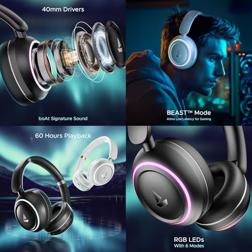 About this item Blazing RGB LEDs with 6 Modes: Amp your audio corner with the striking design of the boAt Rockerz 480 Bluetooth Headphones. The blazing RGB LEDs on these headphones are integrated with 6 modes that can be modified as per your preference. BEAST Mode: Play solo or multiplayer games by activating BEAST mode. Its 40 ms low latency eliminates pesky lag for a realistic feel. 60 hours of Playback: Charge less and enjoy more with the massive playtime of these headphones. Tune into your playlist or podcasts uninterrupted without charging these headphones for up to 60 hours. 40 mm Drivers: No matter what you’re listening to, the bass-heavy boAt Signature Sound from the 40 mm drivers lends an impressive soundstage that brings your music to life. ENx Technology: Answer calls from a busy workspace, public transport, or café, with ENx technology that removes noise ensuring that you can speak and hear without looking for a quiet spot. Dual Pairing: Take calls on your phone and resume the movie on your laptop without disconnecting and reconnecting these headphones each time. Dual pairing in these headphones makes your everyday hustle easier. Bluetooth v5.3 Compatibility: Catch up on the latest series while commuting or call your buddies with wireless comfort courtesy of Bluetooth v5.3.