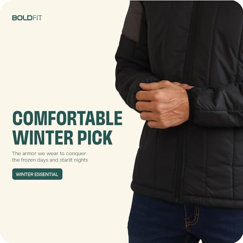 Buy Boldfit Men’s Quilted Polyester Standard Length Jacket Monsoon Winter Wear Hooded Winter Padded Bomber Full Sleeve Jacket Black Grey Large