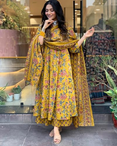 Buy GoSriKi Women’s Rayon Blend Anarkali Printed Kurta with Pant & Dupatta & Dupatta (CIA Yellow-GS_XL_Yellow_X-Large)