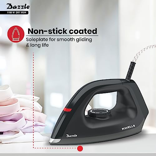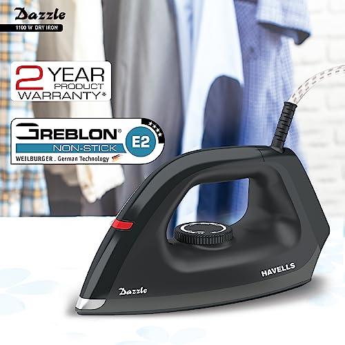 Buy Havells Dry Iron Dazzle 1100 Watts, Iron Press, Greblon Non Sick Soleplate with German Technology, Shock Proof Body, Aerodynamic Design, 360° Swivel Cord, 2 Year Manufacturer Warranty (Black) Online at Low Prices in India –