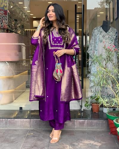 GoSriKi Women’s Silk Blend Straight Embroidered Kurta with Pant & Dupatta (MANUSHI BEGANI-GS_XL_Begani_X-Large) : Clothing & Accessories