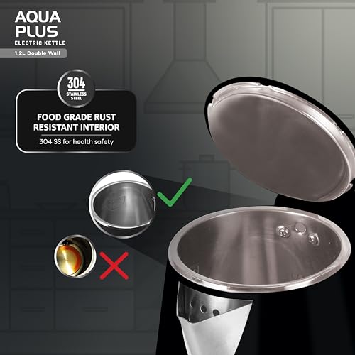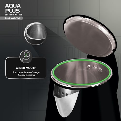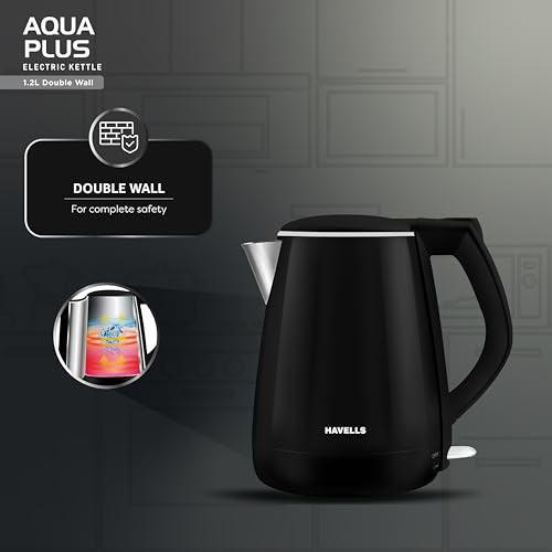 Havells Aqua Plus Electric Kettle 1.2 Litre, 1250 Watt | 304 Stainless Steel Inner Body | Cool Touch Body | Auto Shut-Off |Wider Mouth| 2 Year Warranty (Black) : Home & Kitchen