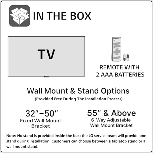 Additional information: Brand Warranty can be availed using amazon invoice and User manual can be accessed from brand website ,Included Components: 1 HD TV, 1 Remote with 2AAA Batteries (Note: LG does not include a TV stand inside the box. A free wall mount or table-top stand will be provided and installed by LG’s technician during installation. Customers can choose one option at the time of service.) |