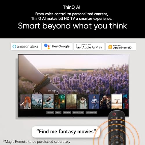 About this item Resolution: HD Ready (1366×768) | Refresh Rate: 60 hertz | 178 Degree wide viewing angle Connectivity: 2 HDMI ports to connect set top box, Blu Ray players, gaming console | 1 USB port to connect hard drives and other USB devices | Bluetooth Connectivity Sound: 10W Watts Output | Built-in Speaker Produce Stereo Sound | AI Sound | Virtual Surround Sound 5.1 up-mix | Bluetooth Surround Ready Smart TV Features: α5 Gen 6 AI Processor | Web OS Operating System | Wi-Fi | Magic Remote Compatible | Full Web Browser | Screen Share | Game Optimizer | AI Functions | Dynamic Tone Mapping | HDR 10 | 1 GB RAM | 8 GB ROM | Supported Apps: Prime Video, Netflix, Jio Hotstar, Sony Liv, Zee5, Apple TV and more | Energy Rating: 1 Star | Annual Energy Consumption: 61.22 kWh/Year Display: LED HD Display | HD Ready Digital Video Format | Slim & Stylish Design Warranty Information: 1-Year LG India Standard Warranty on Product from the date of purchase (T&C Apply) and 1-year standard warranty on the remote control (only for tech defect in remote controller). Warranty claims can be processed using the Amazon e-invoice. Additional information: Brand Warranty can be availed using amazon invoice and User manual can be accessed from brand website | Included Components: 1 HD TV, 1 Remote with 2AAA Batteries (Note: LG does not include a TV stand inside the box. A free wall mount or table-top stand will be provided and installed by LG’s technician during installation. Customers can choose one option at the time of service.)