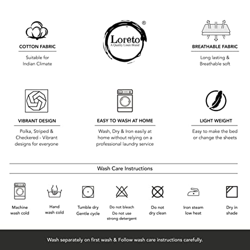 About this item Premium 100% Cotton Comfort: Loreto bedsheets are made from breathable, soft cotton fabric that ensures a cool and refreshing sleep. Their luxurious feel makes them ideal for all-season use. Versatile Sizes & Styles: Whether you need a single bed sheet, a double bed sheet, or a king-size bed sheet made of cotton, Loreto offers a wide range of designs to suit every style preference, adding elegance to your bedroom. Single Size Bed Sheet Set – 1 Flat sheet 54″x 84″ or 137 cm x 213 cm, 1 Pillowcase 17″x 27″ or 43 cm x 68 cm. Ideal for a single size bed. Easy Maintenance: Machine and hand washable for convenience. Follow simple care instructions – wash separately on first use, use a mild detergent, avoid prolonged soaking, no bleach. Iron gently at low heat and dry in the shade to maintain vibrancy and softness Perfect Gift for Loved Ones: Surprise friends and family with a stylish and comfortable printed cotton bed sheet set. A thoughtful choice for housewarming, weddings, or anniversaries.