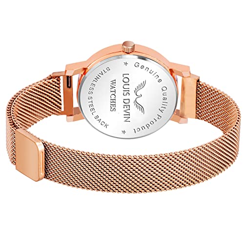 LOUIS DEVIN Rose Gold Plated Mesh Chain Analog Wrist Watch for Women (Blue Dial) | LD-RG162-BLU : Fashion