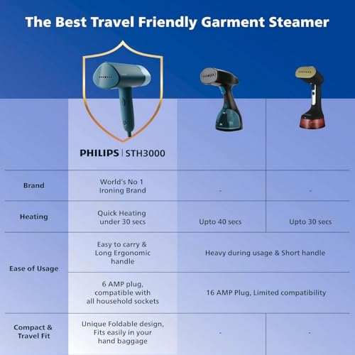 About this item LIGHT, COMPACT & FOLDABLE: Our 3000 series handheld steamer is designed to be light, compact and foldable for easy usage and storage NO BURNS GURANTEED: Safe on all ironable fabrics thanks to OptimalTemp technology – no burns guaranteed NO IRONING BOARD: No ironing board needed – hassle-free steaming WATER TANK: 100 ml detachable water tank for steaming up to one full outfit – easy to refill READY TO USE IN 30 SECS: Ready to use in as little as 30 seconds – light indicates when the steamer is ready to be used. POWER: 1000 watts with up to 20 g/min continuous steam rate for quick and convenient steaming KILLS BACTERIA: Steam helps kill 99.9% of bacteria. WORLD’S NUMBER 1: Philips is the World’s No.1 Ironing brand (Source: Euromonitor International, per irons category definition; retail volume sales in units, 2022 data)