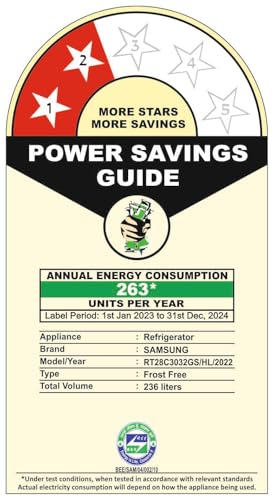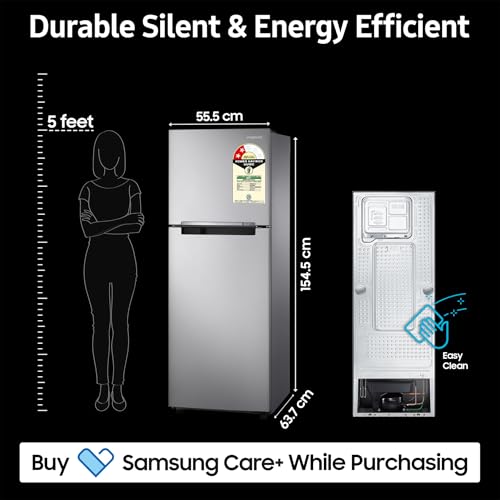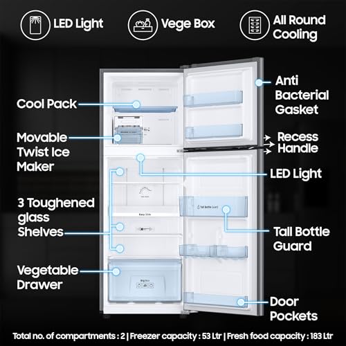 About this item Frost Free Refrigerator: Auto Defrost with powerful cooling and long lasting freshness and performance Capacity 236 liters: Suitable for families with 2 to 3 members Energy Rating : 2 Star Energy Efficiency | Annual Energy Consumption : 263 Kilowatt Hours Per Year Manufacturer Warranty : The product comes with a 1 year comprehensive warranty and a 20 years warranty on the digital inverter compressor (Note: Brand Warranty can be availed using seller invoice) Digital Inverter Compressor provides greater energy efficiency, less noise and long-lasting performance while consuming 50% less power, backed up by 20 year warranty Interior Description : Fresh Food Capacity : 183 Ltr | Freezer Capacity : 53 Ltr | Total no. of compartments : 2 | Shelves : 2 | Vegetable Drawers : 1 | Shelf Type : Toughened Glass Shelves | Anti Bacterial Gasket | Temperature Control : External Samsung Exclusive Features : Power Cool | Fresh room | Easy Slide Shelf | All Round Cooling
