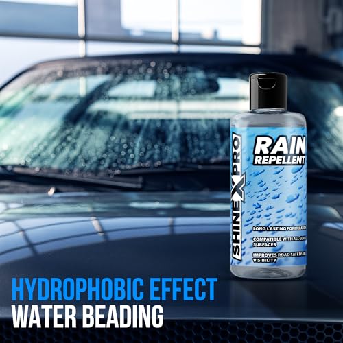 About this item SUPERIOR WATER BEADING: ShineXPro Rain Repellent for Car Windshield is specially formulated to cause rainwater to bead up and roll off the glass instantly, significantly enhancing visibility and driving safety in all weather conditions. LONG-LASTING PROTECTION: ShineXPro Windshield Water Repellent provides durable performance that lasts for weeks, even through heavy rains and regular windshield cleaning. IMPROVES DRIVING VISIBILITY: ShineXPro Car Mirror Rain Protector forms a durable, transparent barrier on your glass surfaces, preventing rainwater from adhering to the surface and ensuring weeks of clear, unobstructed driving visibility. EASY & MULTI-PURPOSE APPLICATION: ShineXPro Car Windshield Rain Repellent is extremely easy to apply and can be used on all glass surfaces including windshields, side mirrors and windows. VALUE FOR MONEY: A single bottle of the Car Glass Water Repellent is sufficient to coat two entire cars.