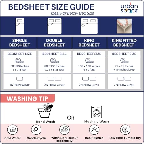 About this item Luxurious 100% Cotton Fabric: Our bedsheet for double bed is crafted from premium long-staple cotton, providing a soft and soothing touch that’s perfect for sensitive skin, ensuring your comfort throughout the night. Available in Multiple Sizes: Whether you need a king size bedsheet cotton or a double size bedsheet cotton, our range has you covered. Choose from Single, Double, and King sizes, with options featuring elastic fitted for a perfectly snug fit on your mattress. Complete Bedding Set: Pack includes 1 Bedsheet + 2 Pillow Cover , ensuring your bedding is beautifully coordinated and inviting. Easy Care & Durable Design: Enjoy sheets that are designed for longevity with features like no color bleeding, minimal lint formation, and low shrinkage primarily in the first wash. For best results, machine wash at low temperatures and wash dark colors separately. Stylish Home Decor & Thoughtful Gift: Elevate your bedroom’s ambiance with our elegantly designed bed sheets, available in vibrant colors and complemented by Urban Space’s AC blankets. An ideal gifting choice for housewarmings, weddings, or anniversaries, these bedsheets offer luxury and practicality under ₹1000.